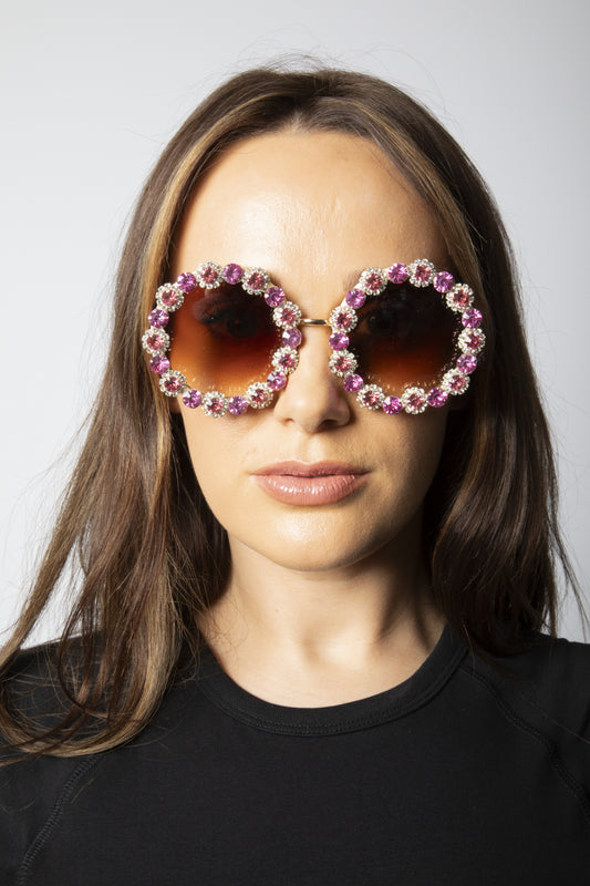 Round Floral Crystal Gem Sunglasses in Pink